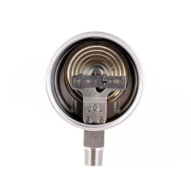 Nabuo ito sa pamamagitan ng pag -welding ng mga gilid ng dalawang diaphragms ng metal (karaniwang gawa sa haluang metal na tanso o hindi kinakalawang na asero), na lumilikha ng isang selyadong flat circular box. Kapag ang sinusukat na daluyan ay pumapasok sa kahon ng dayapragm, ang dayapragm ay sumasailalim sa nababanat na pagpapapangit (pagpapalawak o pag -urong) dahil sa epekto ng presyon. Ito ang "mapagkukunan ng kapangyarihan" para sa pagsukat ng presyon.